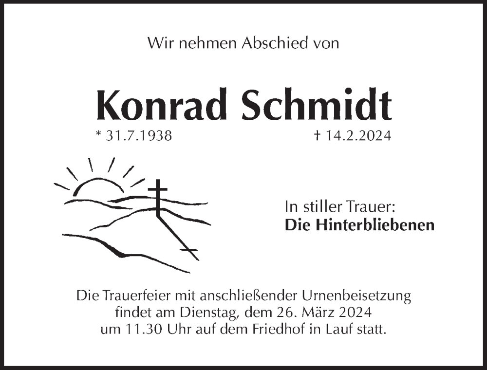 Hier finden Sie alle Traueranzeigen aus der Zeitung, die bisher für Konrad Schmidt erschienen sind. Weitere Traueranzeigen, die in der Zeitung erscheinen, werden hier ebenfalls aufgelistet