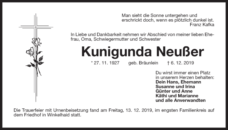 Hier finden Sie alle Traueranzeigen aus der Zeitung, die bisher für Kunigunda Neußer erschienen sind. Weitere Traueranzeigen, die in der Zeitung erscheinen, werden hier ebenfalls aufgelistet
