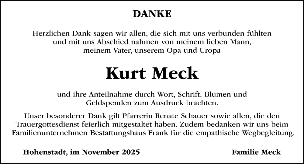Hier finden Sie alle Traueranzeigen aus der Zeitung, die bisher für Kurt Meck erschienen sind. Weitere Traueranzeigen, die in der Zeitung erscheinen, werden hier ebenfalls aufgelistet