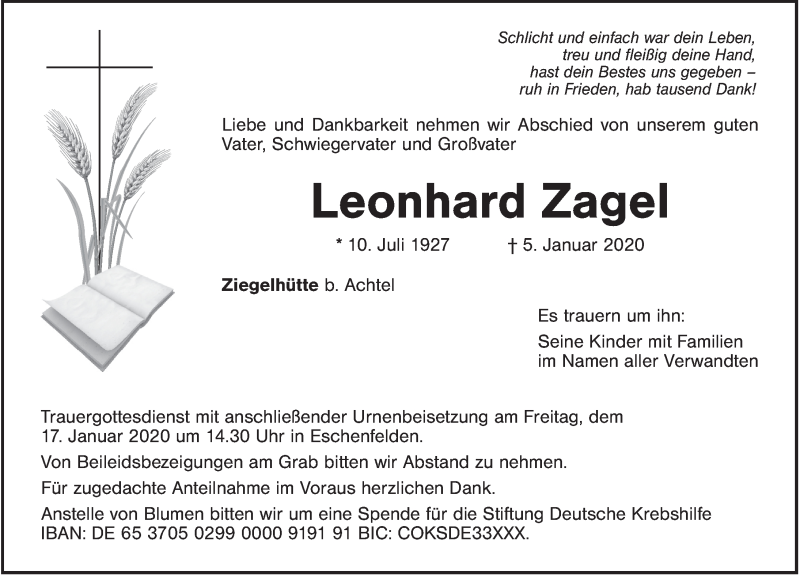 Hier finden Sie alle Traueranzeigen aus der Zeitung, die bisher für Leonhard Zagel erschienen sind. Weitere Traueranzeigen, die in der Zeitung erscheinen, werden hier ebenfalls aufgelistet