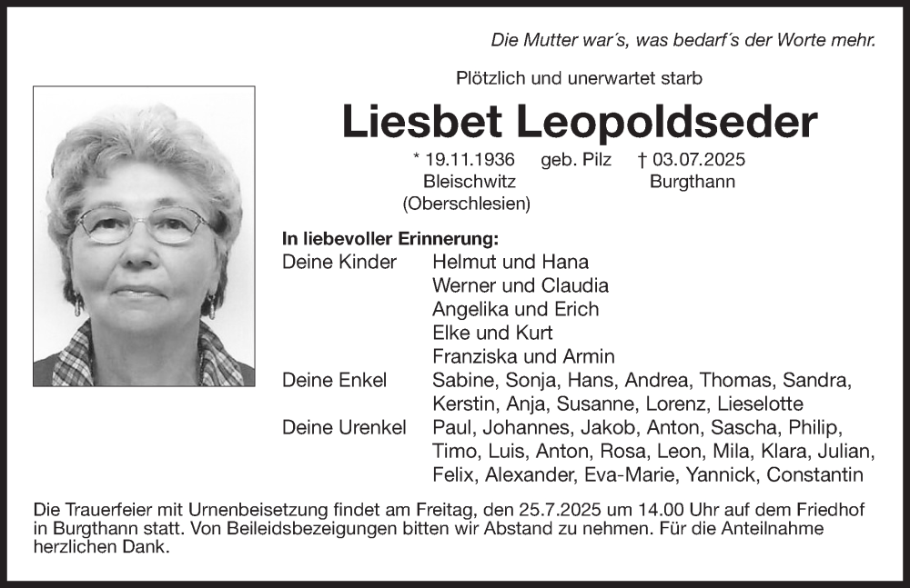 Hier finden Sie alle Traueranzeigen aus der Zeitung, die bisher für Liesbet Leopoldseder erschienen sind. Weitere Traueranzeigen, die in der Zeitung erscheinen, werden hier ebenfalls aufgelistet