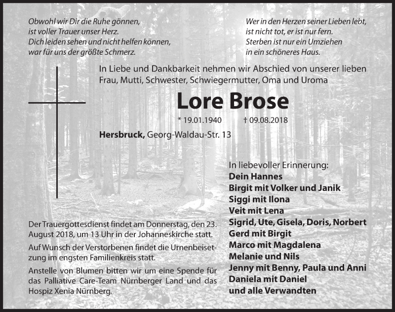 Hier finden Sie alle Traueranzeigen aus der Zeitung, die bisher für Lore Brose erschienen sind. Weitere Traueranzeigen, die in der Zeitung erscheinen, werden hier ebenfalls aufgelistet