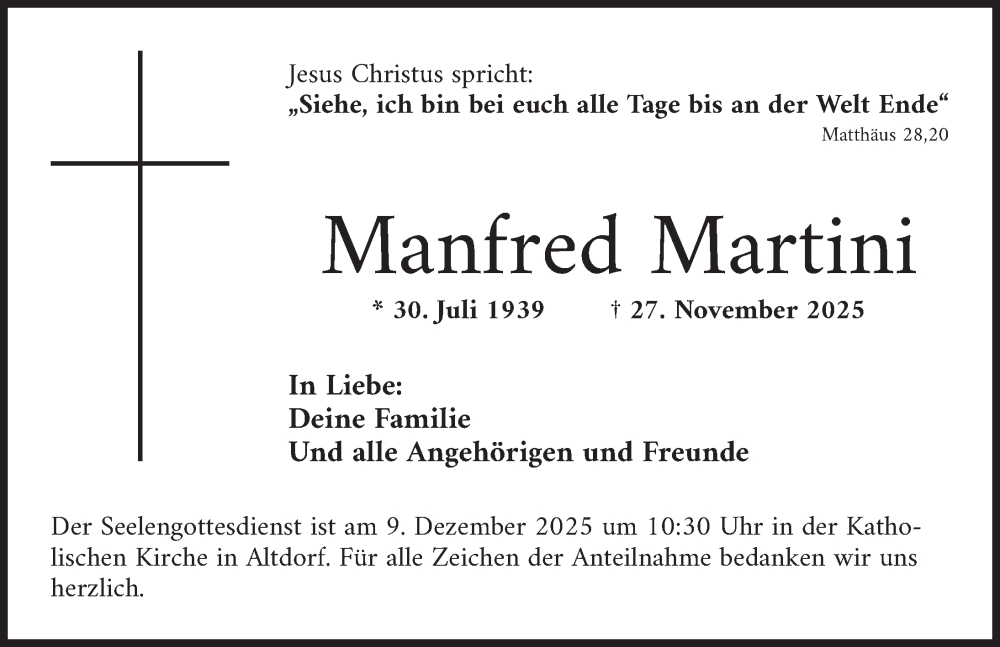 Hier finden Sie alle Traueranzeigen aus der Zeitung, die bisher für Manfred Martini erschienen sind. Weitere Traueranzeigen, die in der Zeitung erscheinen, werden hier ebenfalls aufgelistet