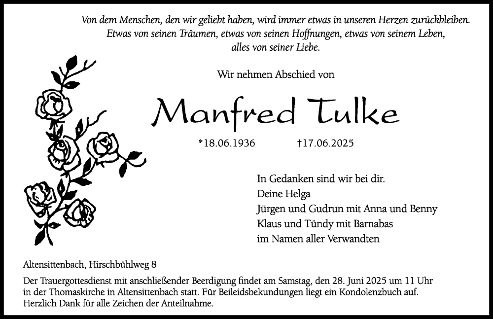 Hier finden Sie alle Traueranzeigen aus der Zeitung, die bisher für Manfred Tulke erschienen sind. Weitere Traueranzeigen, die in der Zeitung erscheinen, werden hier ebenfalls aufgelistet