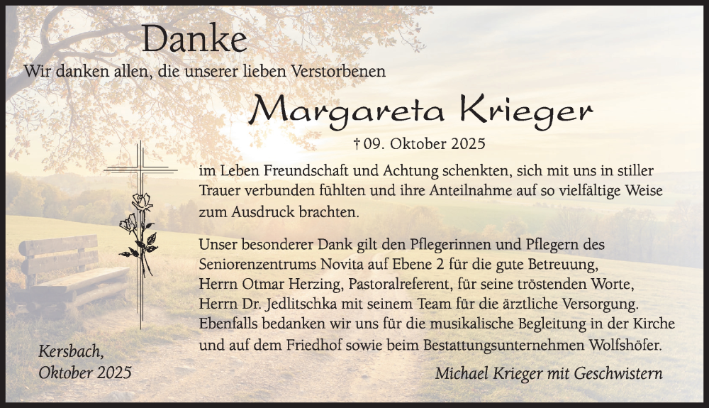 Hier finden Sie alle Traueranzeigen aus der Zeitung, die bisher für Margareta Krieger erschienen sind. Weitere Traueranzeigen, die in der Zeitung erscheinen, werden hier ebenfalls aufgelistet