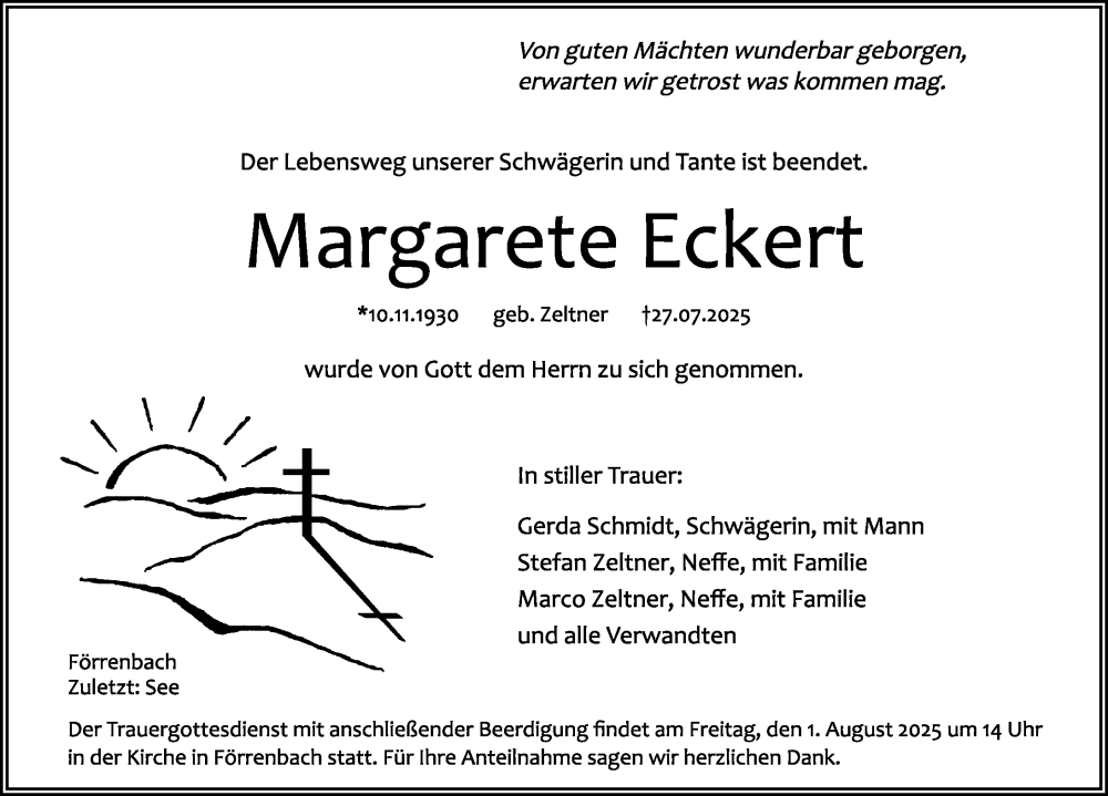 Hier finden Sie alle Traueranzeigen aus der Zeitung, die bisher für Margarete Eckert erschienen sind. Weitere Traueranzeigen, die in der Zeitung erscheinen, werden hier ebenfalls aufgelistet