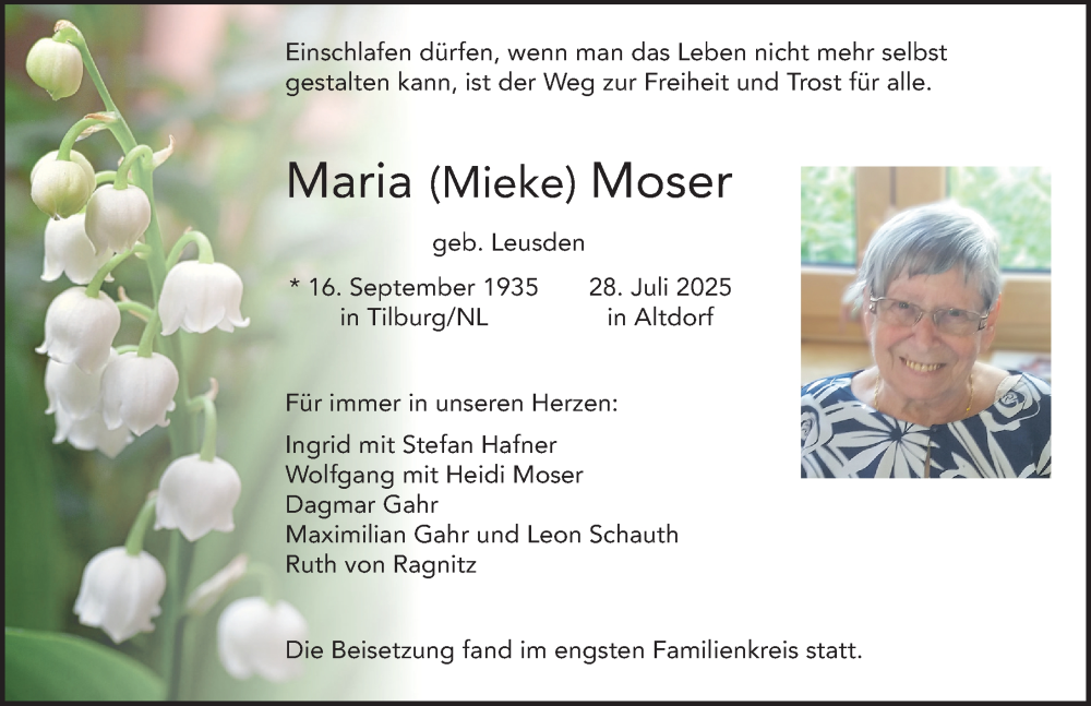 Hier finden Sie alle Traueranzeigen aus der Zeitung, die bisher für Maria Moser erschienen sind. Weitere Traueranzeigen, die in der Zeitung erscheinen, werden hier ebenfalls aufgelistet