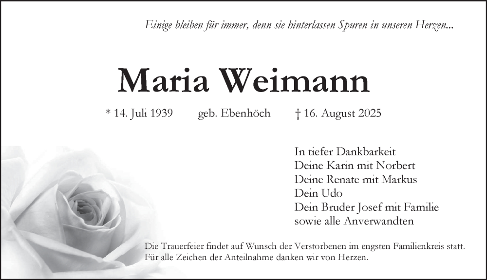 Hier finden Sie alle Traueranzeigen aus der Zeitung, die bisher für Maria Weimann erschienen sind. Weitere Traueranzeigen, die in der Zeitung erscheinen, werden hier ebenfalls aufgelistet