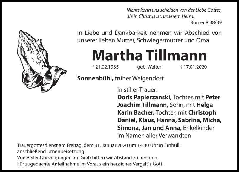 Hier finden Sie alle Traueranzeigen aus der Zeitung, die bisher für Martha Tillmann erschienen sind. Weitere Traueranzeigen, die in der Zeitung erscheinen, werden hier ebenfalls aufgelistet