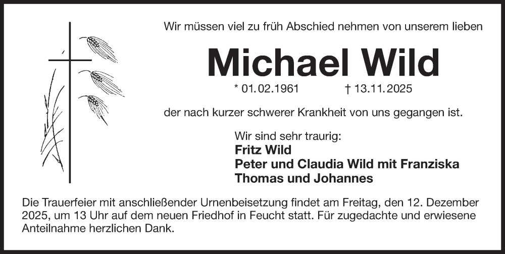 Hier finden Sie alle Traueranzeigen aus der Zeitung, die bisher für Michael Wild erschienen sind. Weitere Traueranzeigen, die in der Zeitung erscheinen, werden hier ebenfalls aufgelistet