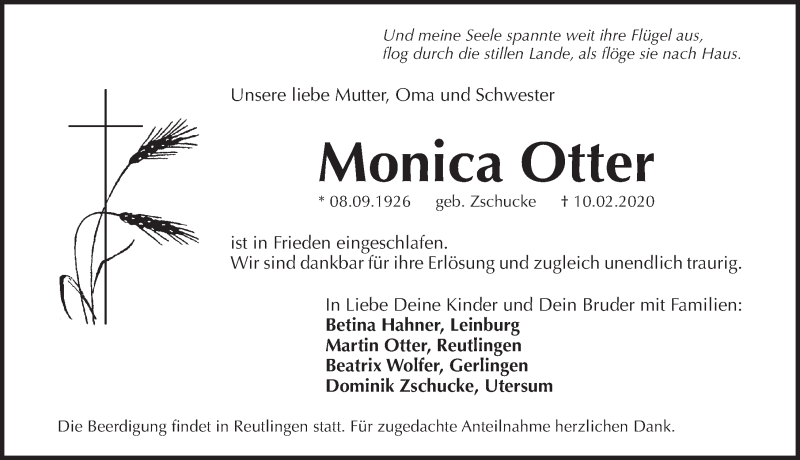 Hier finden Sie alle Traueranzeigen aus der Zeitung, die bisher für Monica Otter erschienen sind. Weitere Traueranzeigen, die in der Zeitung erscheinen, werden hier ebenfalls aufgelistet