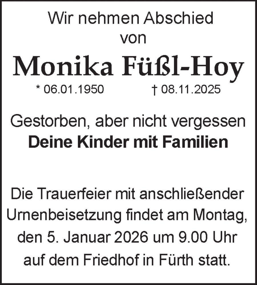 Hier finden Sie alle Traueranzeigen aus der Zeitung, die bisher für Monika Füßl-Hoy erschienen sind. Weitere Traueranzeigen, die in der Zeitung erscheinen, werden hier ebenfalls aufgelistet