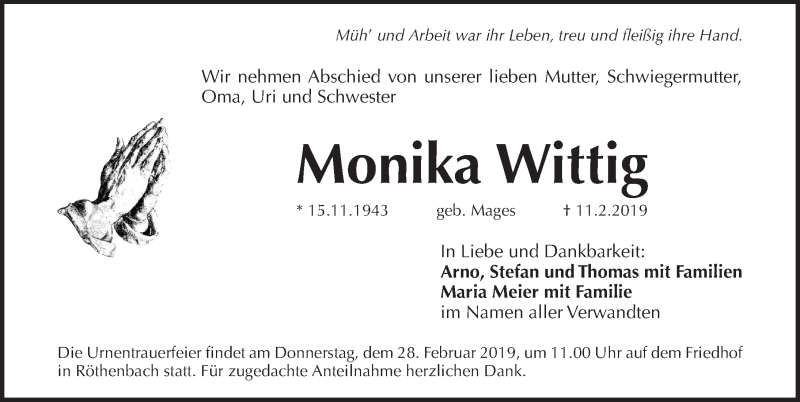 Hier finden Sie alle Traueranzeigen aus der Zeitung, die bisher für Monika Wittig erschienen sind. Weitere Traueranzeigen, die in der Zeitung erscheinen, werden hier ebenfalls aufgelistet