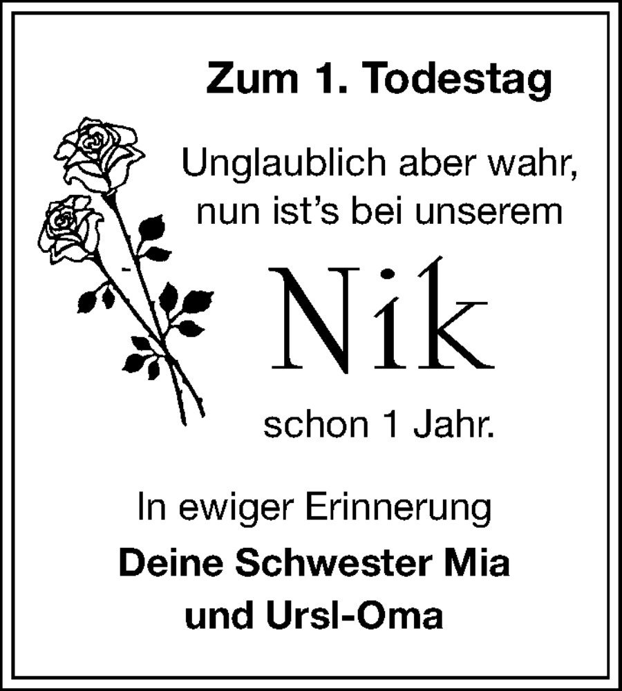 Hier finden Sie alle Traueranzeigen aus der Zeitung, die bisher für Nik erschienen sind. Weitere Traueranzeigen, die in der Zeitung erscheinen, werden hier ebenfalls aufgelistet
