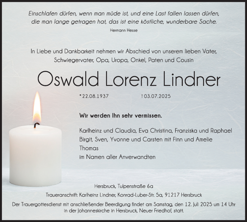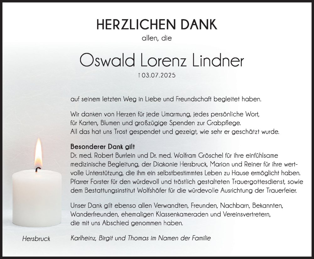 Hier finden Sie alle Traueranzeigen aus der Zeitung, die bisher für Oswald Lorenz Lindner erschienen sind. Weitere Traueranzeigen, die in der Zeitung erscheinen, werden hier ebenfalls aufgelistet