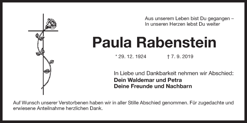 Hier finden Sie alle Traueranzeigen aus der Zeitung, die bisher für Paula Rabenstein erschienen sind. Weitere Traueranzeigen, die in der Zeitung erscheinen, werden hier ebenfalls aufgelistet