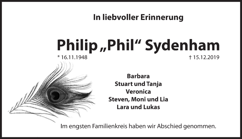 Hier finden Sie alle Traueranzeigen aus der Zeitung, die bisher für Philip Sydenham erschienen sind. Weitere Traueranzeigen, die in der Zeitung erscheinen, werden hier ebenfalls aufgelistet