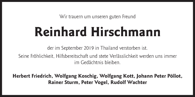 Hier finden Sie alle Traueranzeigen aus der Zeitung, die bisher für Reinhard Hirschmann erschienen sind. Weitere Traueranzeigen, die in der Zeitung erscheinen, werden hier ebenfalls aufgelistet