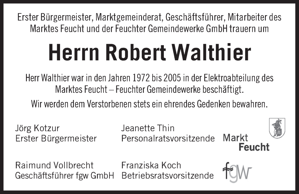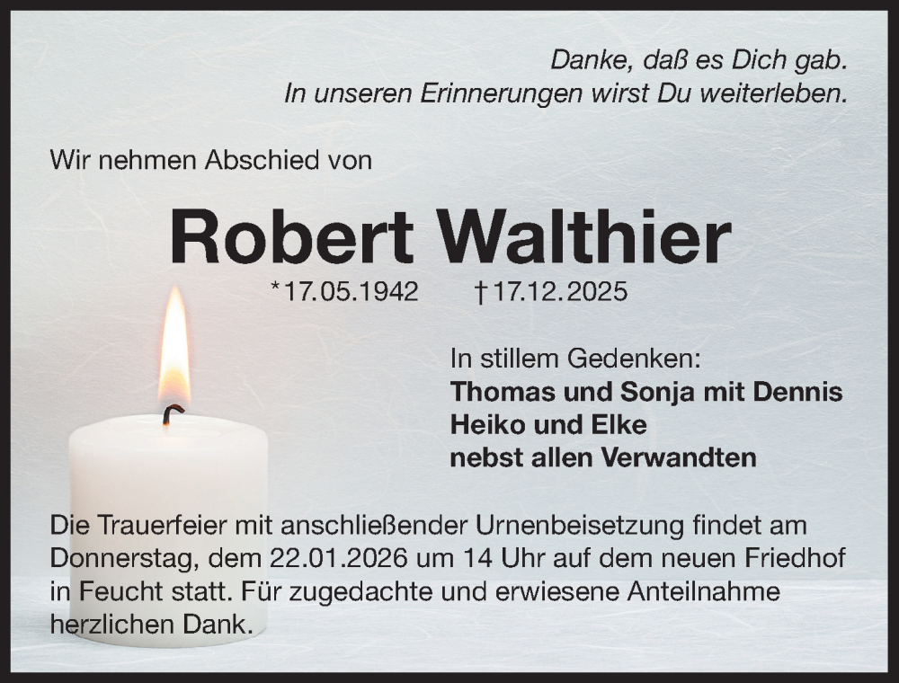 Hier finden Sie alle Traueranzeigen aus der Zeitung, die bisher für Robert Walthier erschienen sind. Weitere Traueranzeigen, die in der Zeitung erscheinen, werden hier ebenfalls aufgelistet