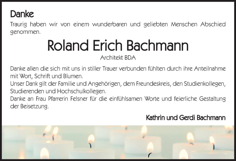 Hier finden Sie alle Traueranzeigen aus der Zeitung, die bisher für Roland Erich Bachmann erschienen sind. Weitere Traueranzeigen, die in der Zeitung erscheinen, werden hier ebenfalls aufgelistet