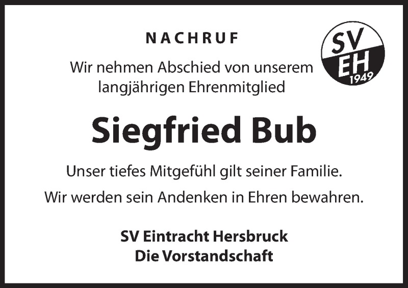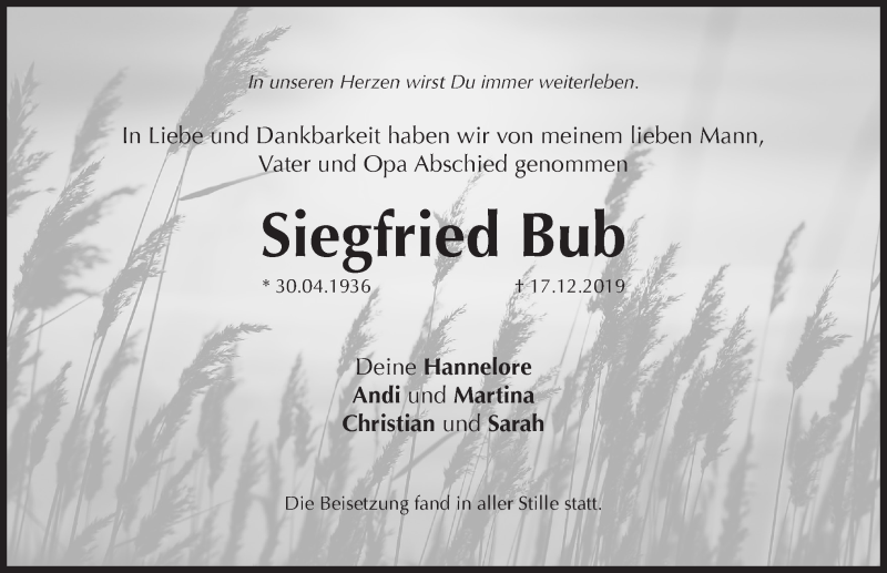 Hier finden Sie alle Traueranzeigen aus der Zeitung, die bisher für Siegfried Bub erschienen sind. Weitere Traueranzeigen, die in der Zeitung erscheinen, werden hier ebenfalls aufgelistet