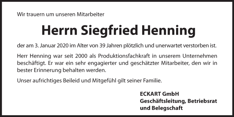 Hier finden Sie alle Traueranzeigen aus der Zeitung, die bisher für Siegfried Henning erschienen sind. Weitere Traueranzeigen, die in der Zeitung erscheinen, werden hier ebenfalls aufgelistet