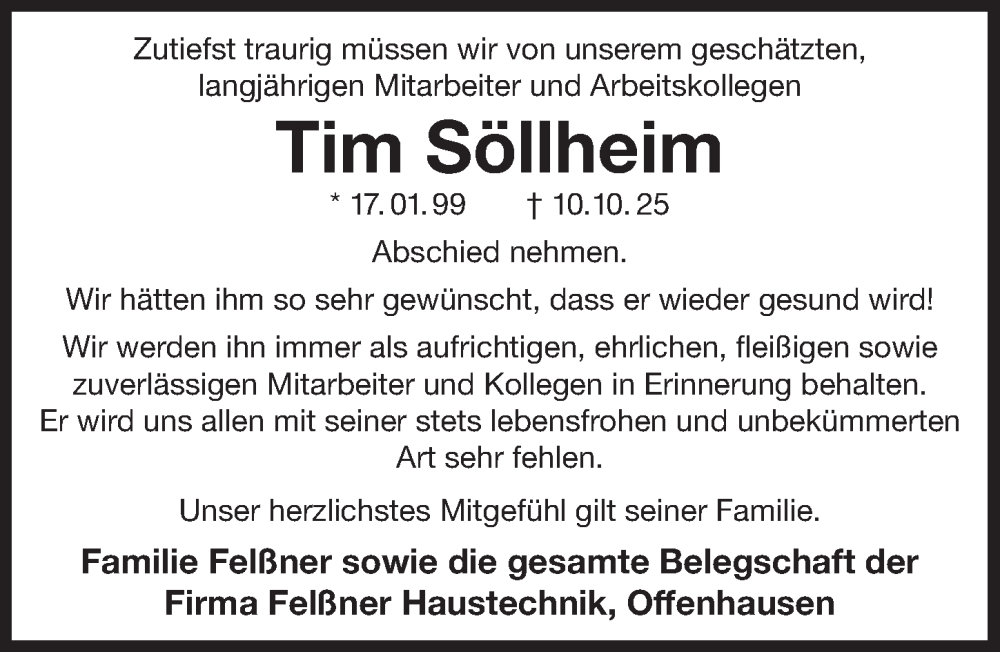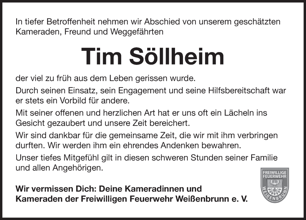 Hier finden Sie alle Traueranzeigen aus der Zeitung, die bisher für Tim Söllheim erschienen sind. Weitere Traueranzeigen, die in der Zeitung erscheinen, werden hier ebenfalls aufgelistet
