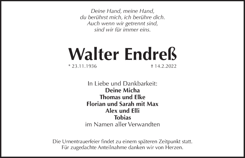 Hier finden Sie alle Traueranzeigen aus der Zeitung, die bisher für Walter Endreß erschienen sind. Weitere Traueranzeigen, die in der Zeitung erscheinen, werden hier ebenfalls aufgelistet
