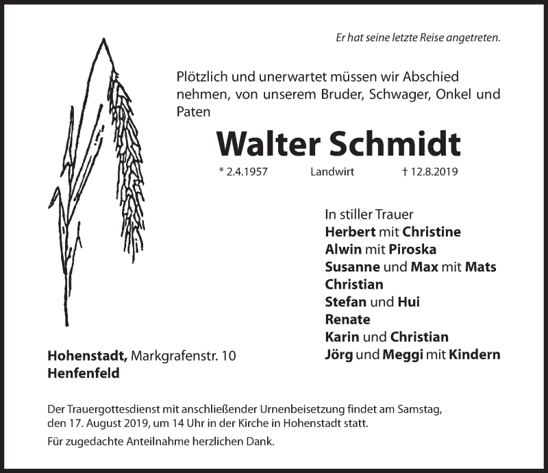 Hier finden Sie alle Traueranzeigen aus der Zeitung, die bisher für Walter Schmidt erschienen sind. Weitere Traueranzeigen, die in der Zeitung erscheinen, werden hier ebenfalls aufgelistet