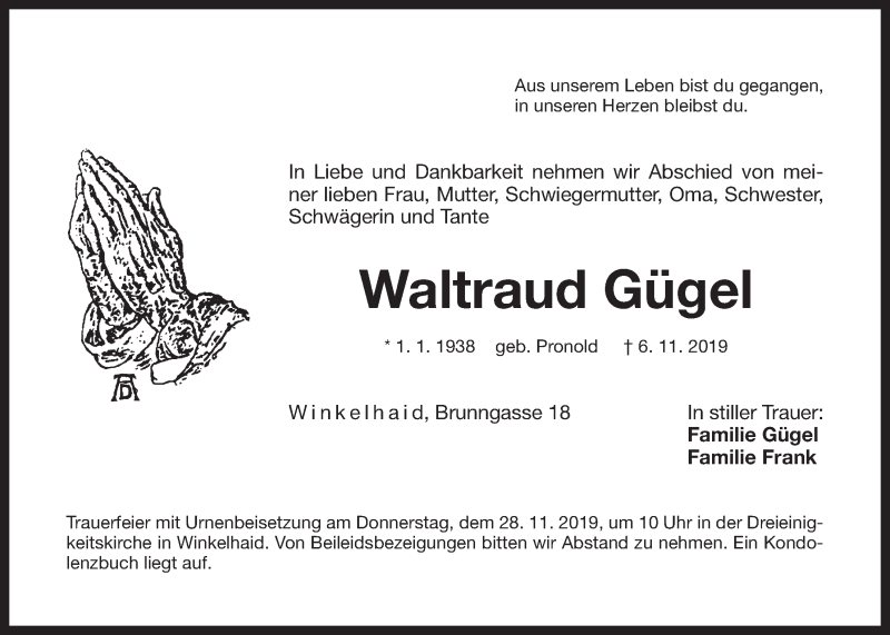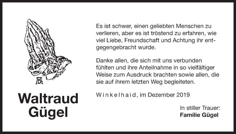 Hier finden Sie alle Traueranzeigen aus der Zeitung, die bisher für Waltraud Gügel erschienen sind. Weitere Traueranzeigen, die in der Zeitung erscheinen, werden hier ebenfalls aufgelistet
