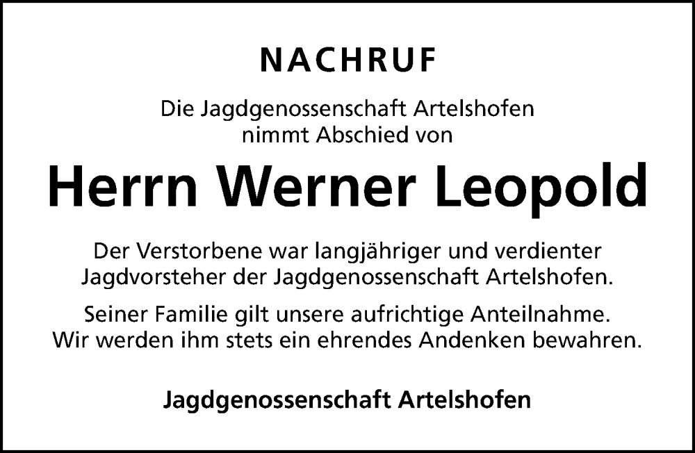 Hier finden Sie alle Traueranzeigen aus der Zeitung, die bisher für Werner Leopold erschienen sind. Weitere Traueranzeigen, die in der Zeitung erscheinen, werden hier ebenfalls aufgelistet