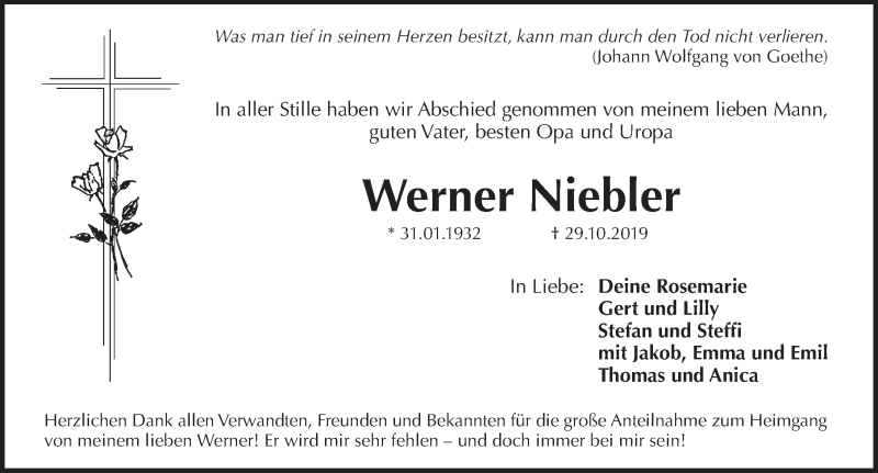Hier finden Sie alle Traueranzeigen aus der Zeitung, die bisher für Werner Niebler erschienen sind. Weitere Traueranzeigen, die in der Zeitung erscheinen, werden hier ebenfalls aufgelistet