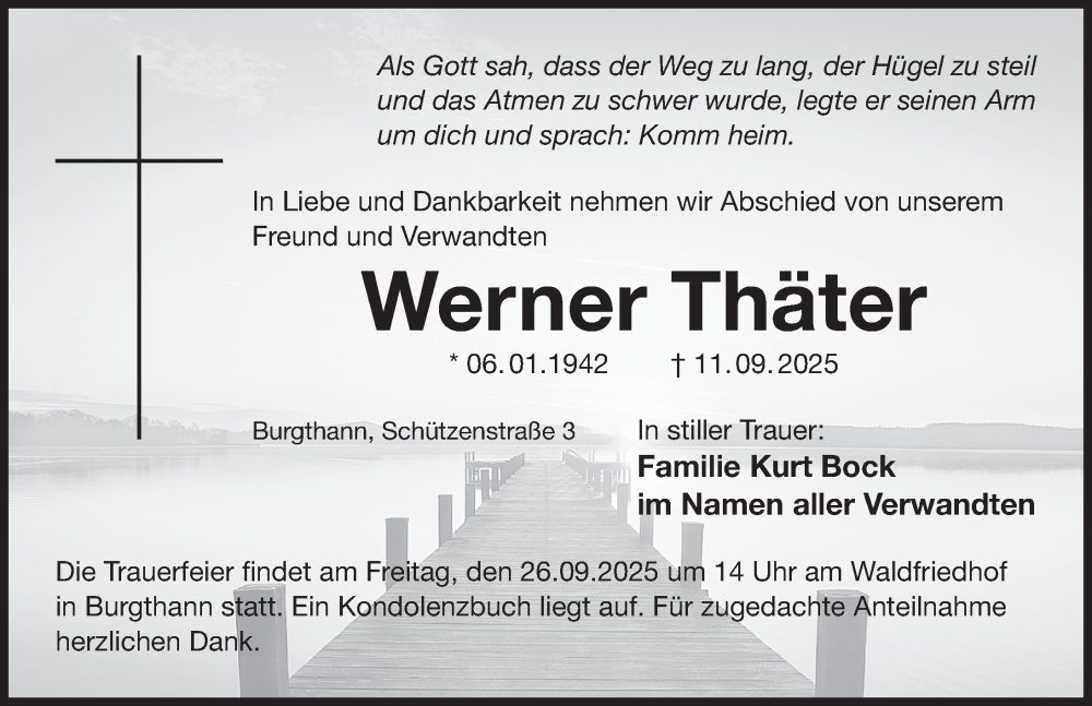 Hier finden Sie alle Traueranzeigen aus der Zeitung, die bisher für Werner Thäter erschienen sind. Weitere Traueranzeigen, die in der Zeitung erscheinen, werden hier ebenfalls aufgelistet