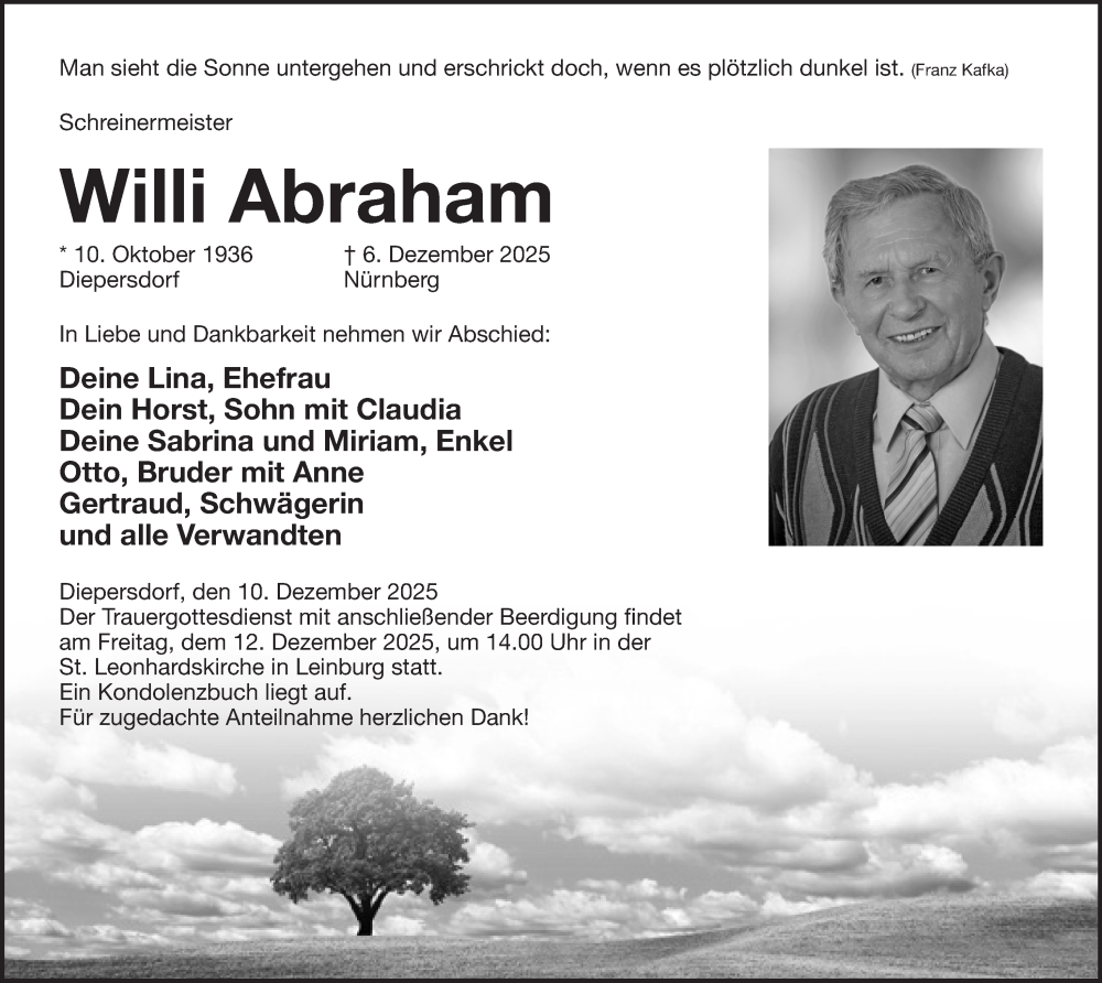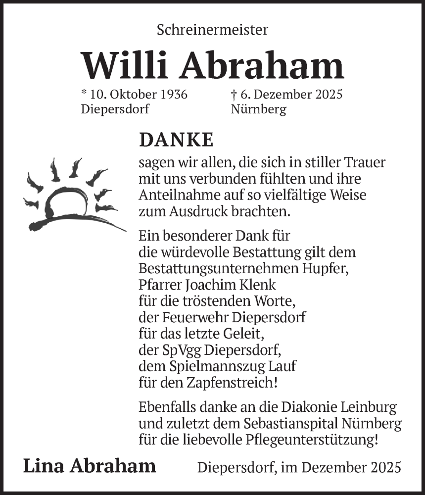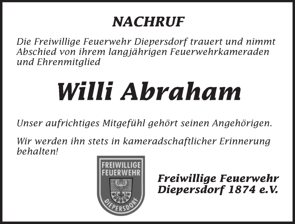 Hier finden Sie alle Traueranzeigen aus der Zeitung, die bisher für Willi Abraham erschienen sind. Weitere Traueranzeigen, die in der Zeitung erscheinen, werden hier ebenfalls aufgelistet