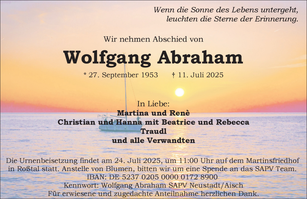 Hier finden Sie alle Traueranzeigen aus der Zeitung, die bisher für Wolfgang Abraham erschienen sind. Weitere Traueranzeigen, die in der Zeitung erscheinen, werden hier ebenfalls aufgelistet