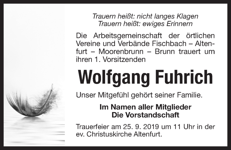 Hier finden Sie alle Traueranzeigen aus der Zeitung, die bisher für Wolfgang Fuhrich erschienen sind. Weitere Traueranzeigen, die in der Zeitung erscheinen, werden hier ebenfalls aufgelistet